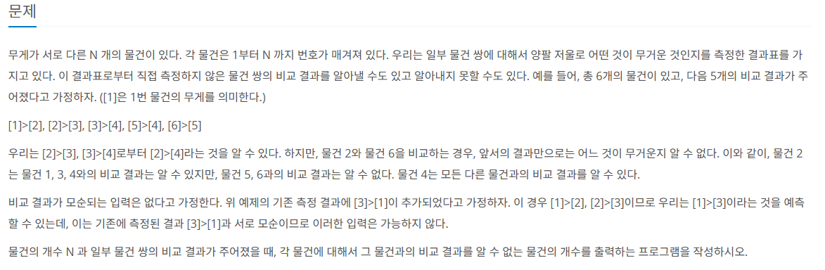 첫 줄에는 물건의 개수 N 이 주어지고, 둘째 줄에는 미리 측정된 물건 쌍의 개수 M이 주어진다. 단, 5 ≤ N ≤ 100 이고, 0 ≤ M ≤ 2,000이다. 다음 M개의 줄에 미리 측정된 비교 결과가 한 줄에 하나씩