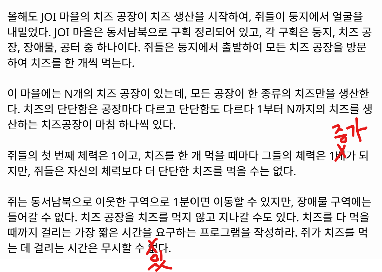 처음에 문제를 읽었을 땐, 치즈를 먹는 순서를 어떻게 정해야 하나 싶었지만, 시작 할 때 쥐의 체력이 1 고정이므로 고민할 필요 없이 1, 2, 3, ..., N 순서대로 먹으면 된다.