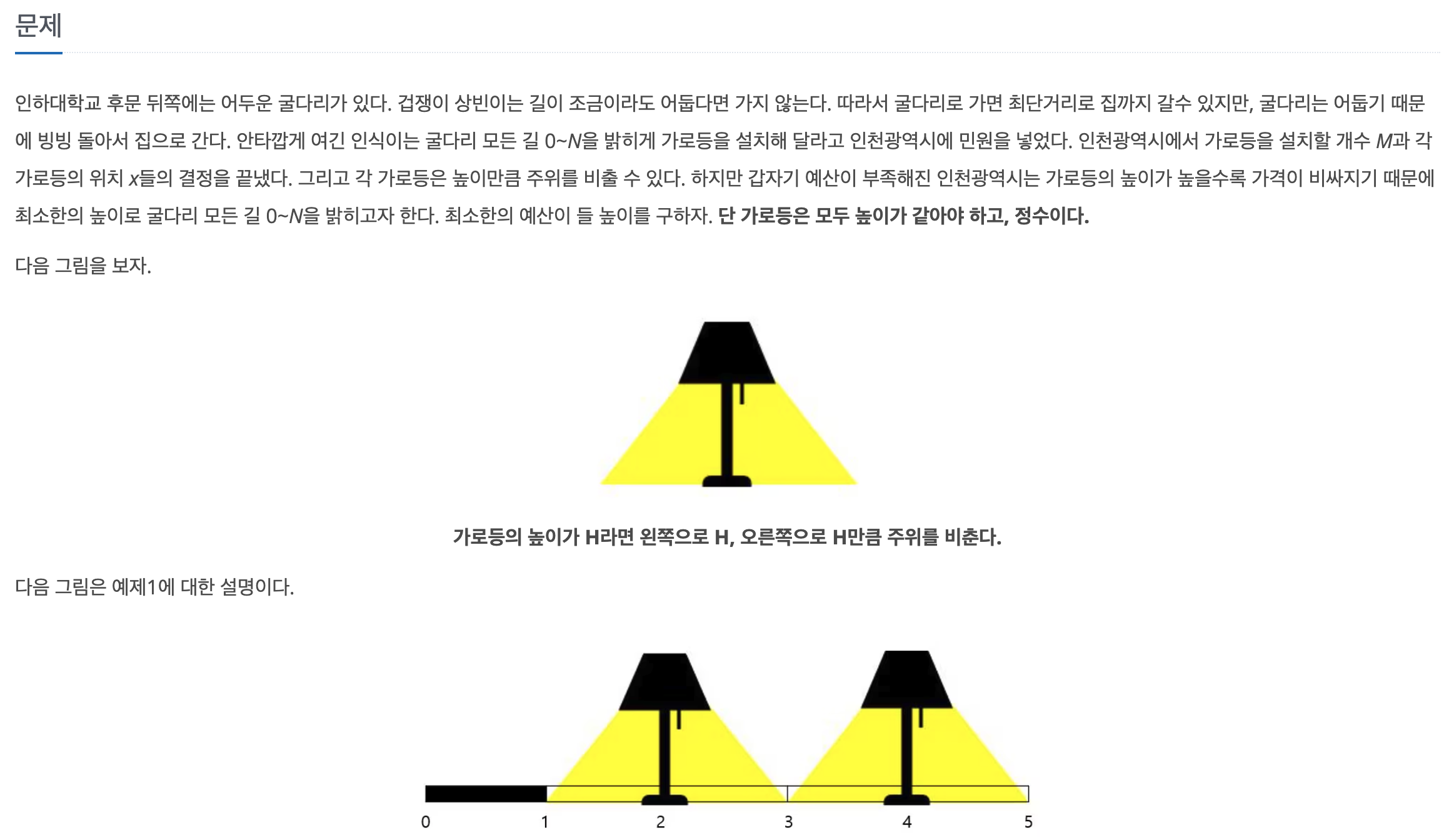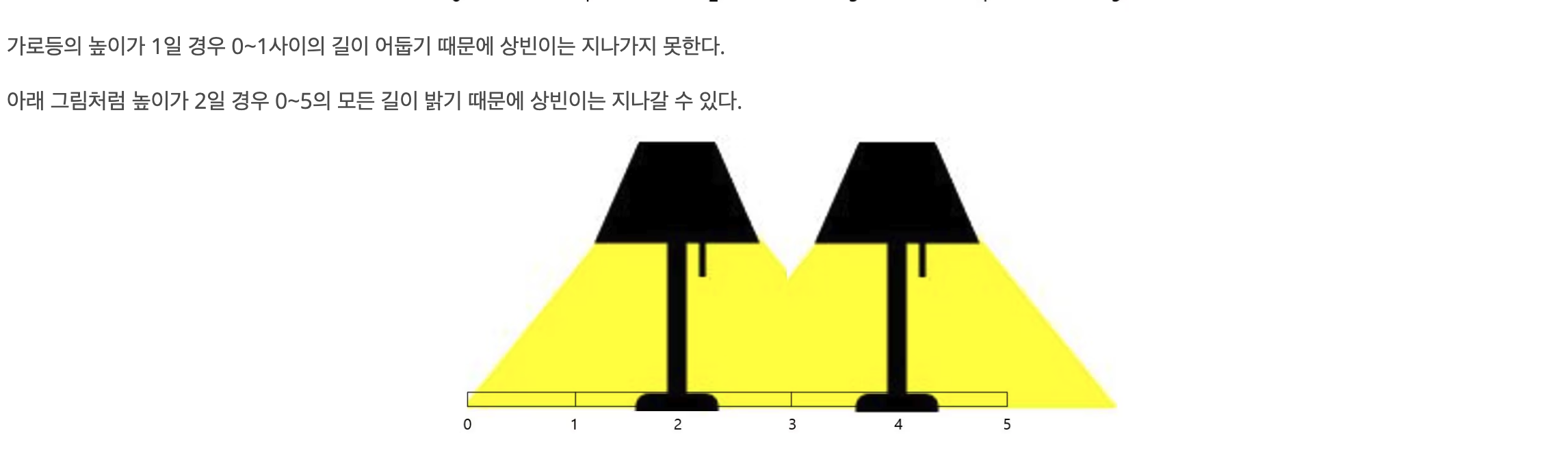 이 문제에는 작은 함정이 하나 있는데, 가로등 사이의 간격이 만약 홀수인 경우에는 2로 나눴을 때 0.5가 내림 되기 때문에 주의해야 한다.