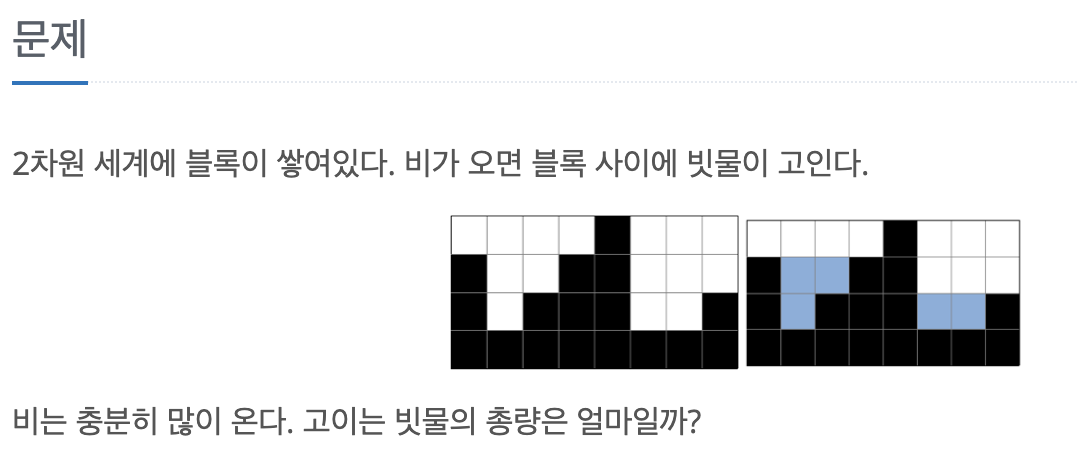 스택 문제이다. 빗물은 양 옆이 블록으로 막혀있을 때, 낮은 블록의 높이를 기준으로 그 사이에 빗물이 고이게 된다. 따라서 스택을 하나 만들고 인덱스 순서대로 입력받은 다음에, "현재까지" 가장 높게 쌓여있던 블록의 높이(currentMax)와 같거나 더 높게 쌓여있는 블록이 스택에 들어오려 할 때, 스택에 쌓여있는 모든 블록들을 빼내면서 고여있는 물의 양을 더하면 된다(currentMax - 중간 블록의 높이).