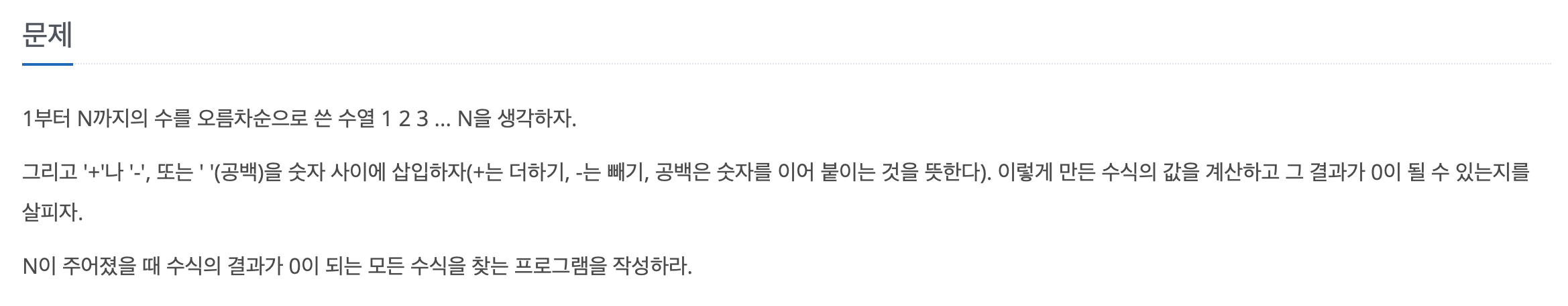DFS 문제이다. 3가지 연산자 (" ", "+", "-")를 배치하는 모든 경우의 수를 수식으로 만든 후 계산하면 된다.