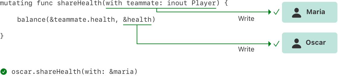 위의 예시에서, Oscar 플레이어가 Maria 플레이어와 체력을 공유하기 위해 shareHealth(with:)를 쓰는 것은 충돌을 야기하지 않는다. oscar가 뮤테이팅 메소드에서 self의 값이기 때문에, oscar에 대한 쓰기 접근 권한이 메소드의 호출 동안 존재하고, maria의 쓰기 접근도 in-out 파라미터로 전달되었기 때문에, 같은 기간동안 존재한다. 아래의 그림처럼, 메모리의 다른 위치에 접근했기 때문에, 같은 시간에 두 쓰기 접근이 오버랩되어도, 충돌하지 않는다.