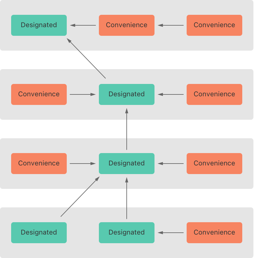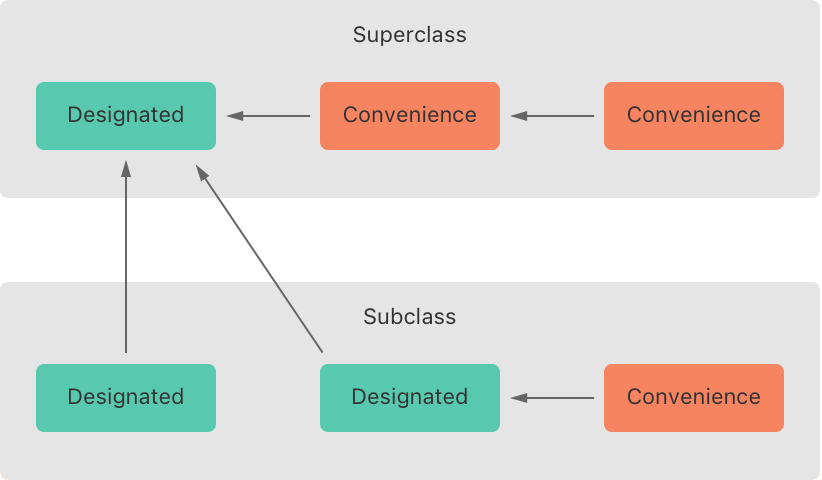 그림에서 슈퍼클래스는 하나의 데지그네이티드 이니셜라이저와 두 개의 컨비니언스 이니셜라이저를 가지고 있다. 그중 하나의 컨비니언스 이니셜라이저는 다른 컨비니언스 이니셜라이저를 호출하고, 호출 받은 컨비니언스 이니셜라이저는 데지그네이티드 이니셜라이저를 호출한다. 이는 위의 규칙 2와 3을 만족한다. 그림의 슈퍼클래스는 다른 슈퍼클래스를 가지지 않으므로 규칙 1은 적용되지 않는다.
